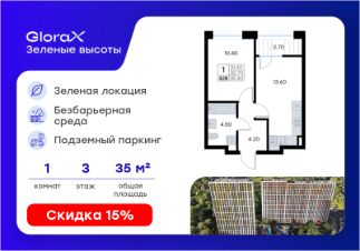 Продается 1-комн. квартира на 3-м этаже в жилом квартале GloraX Зелёные высоты — проекте в тихой зелёной локации. Общая площадь квартиры 35,40 кв. м, из которых 10,40 кв. м включая 10,40 кв. м жилого пространства и 13,60 кв. м кухни. Номер квартиры - 528.