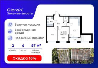 Продается 2-комн. квартира на 6-м этаже в жилом квартале GloraX Зелёные высоты — проекте в тихой зелёной локации. Общая площадь квартиры 57,60 кв. м, из которых 20,70 кв. м включая 20,70 кв. м жилого пространства и 15,00 кв. м кухни. Номер квартиры - 295.