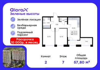 Продается 2-комн. квартира  на 7-м этаже в жилом квартале GloraX Зелёные высоты — проекте в тихой зелёной локации.  Общая площадь квартиры 57,80 кв. м, из которых 21,40 кв. м включая 21,40 кв. м жилого пространства и 15,00 кв. м кухни. Номер квартиры - 60.