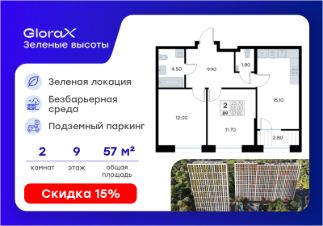 Продается 2-комн. квартира на 9-м этаже в жилом квартале GloraX Зелёные высоты — проекте в тихой зелёной локации. Общая площадь квартиры 57,80 кв. м, из которых 23,70 кв. м включая 23,70 кв. м жилого пространства и 15,10 кв. м кухни. Номер квартиры - 89.