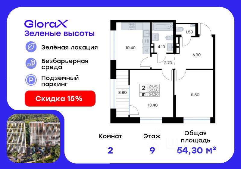 Продается 2-комн. квартира на 9-м этаже в жилом квартале GloraX Зелёные высоты — проекте в тихой зелёной локации. Общая площадь квартиры 54,30 кв. м, из которых 24,90 кв. м включая 24,90 кв. м жилого пространства и 10,40 кв. м кухни. Номер квартиры - 81.