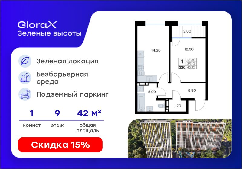 Продается 1-комн. квартира на 9-м этаже в жилом квартале GloraX Зелёные высоты — проекте в тихой зелёной локации. Общая площадь квартиры 42,10 кв. м, из которых 12,30 кв. м включая 12,30 кв. м жилого пространства и 14,30 кв. м кухни. Номер квартиры - 330.