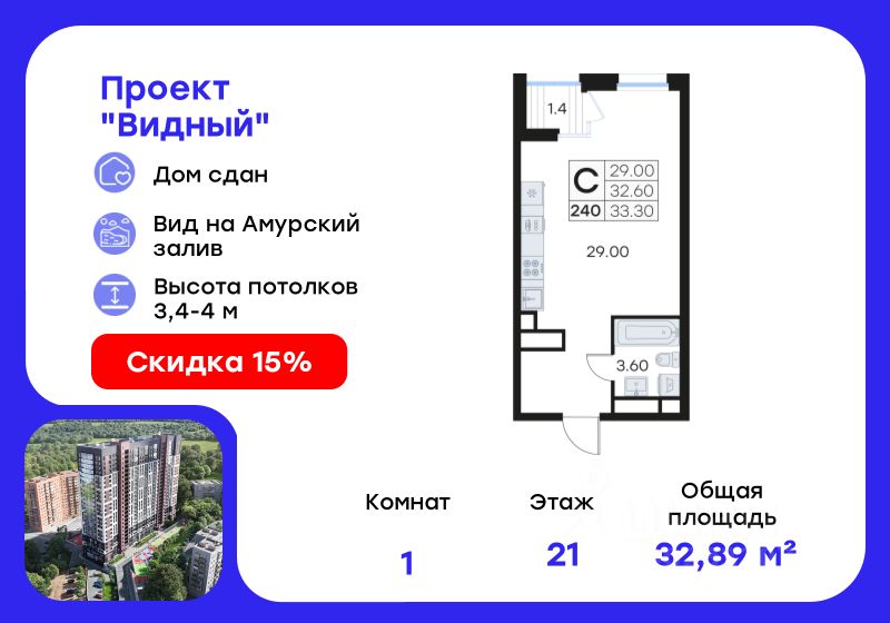 Продается квартира-студия на 21-м этаже в жилом комплексе Видный — современном проекте комфорт-класса в развитом районе Владивостока. Общая площадь лота составляет 32,89 кв. м, из которых 24,62 кв. м отведено под жилую и кв. м под кухонную зону. Номер квартиры - 240.