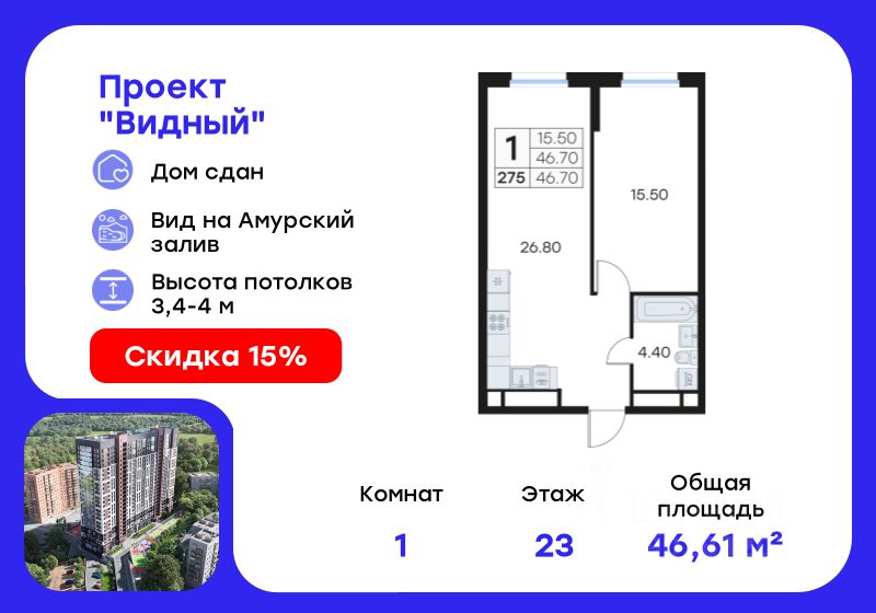 Продается 1-комн. квартира на 23-м этаже в жилом комплексе Видный — современном проекте комфорт-класса в развитом районе Владивостока. Общая площадь лота составляет 46,61 кв. м, из которых 15,58 кв. м отведено под жилую и 21,32 кв. м под кухонную зону. Номер квартиры - 275.
