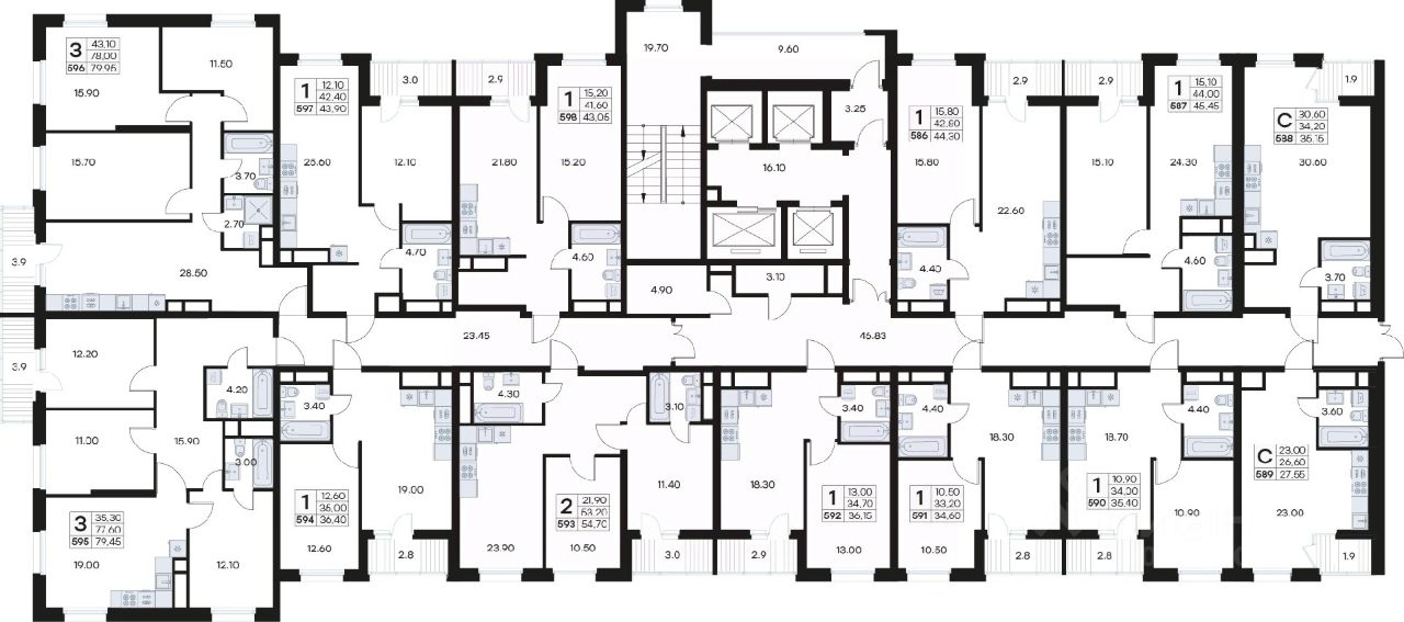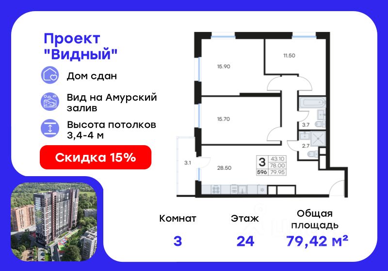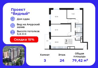 Продается 3-комн. квартира на 24-м этаже в жилом комплексе Видный — современном проекте комфорт-класса в развитом районе Владивостока. Общая площадь лота составляет 79,42 кв. м, из которых 43,04 кв. м отведено под жилую и 17,14 кв. м под кухонную зону. Номер квартиры - 596.