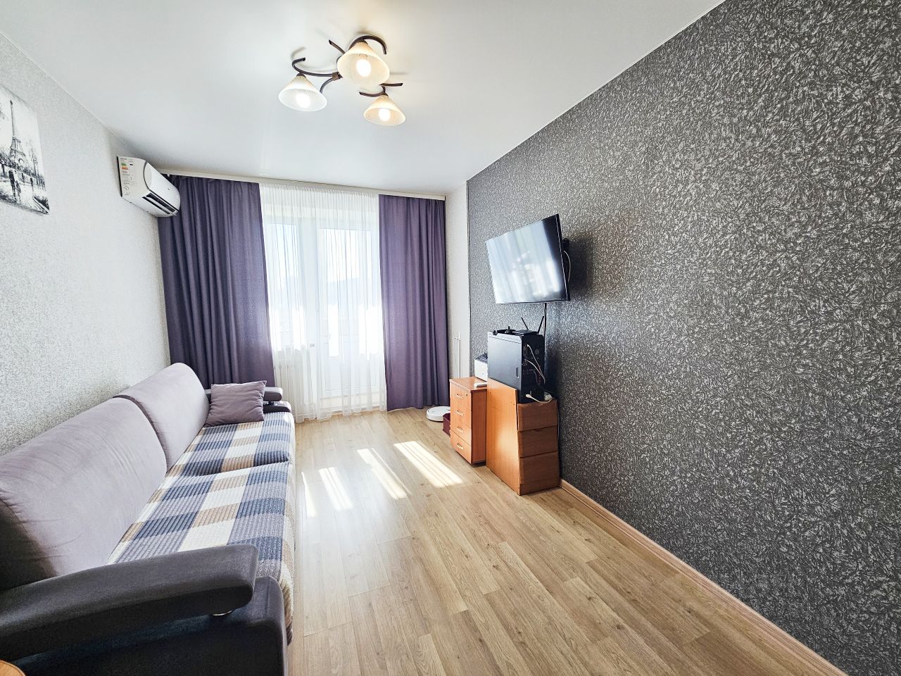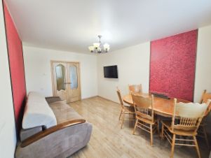 В квартире сделан ремонт, на полу ламинат, стены выровнены. Есть вместительная гардеробная. Все комнаты отдельные, большая гостиная с выходом на лоджию 8 кв м, и просторная кухня.