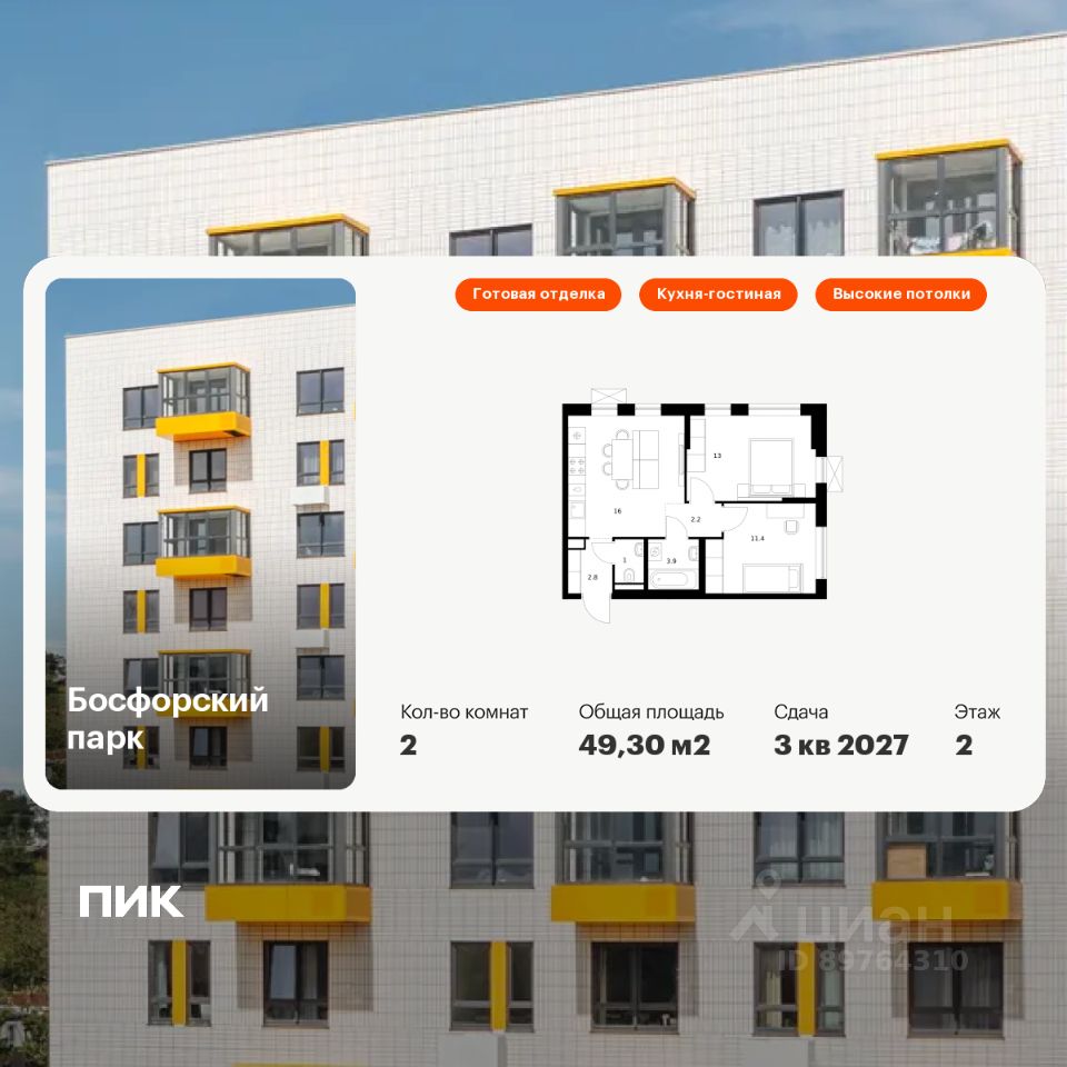Продаётся 2-комн. квартира площадью 49,3 кв.м на 2 этаже 9 этажного дома (Корпус 9, Секция 1) проекта ПИК Босфорский парк. Светлый просторный подъезд на уровне земли, функциональная планировка, большие окна, c отделкой.