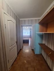 Полы — линолеум, стены — обои, потолок — побелка и натяжной, в санузле кафель,