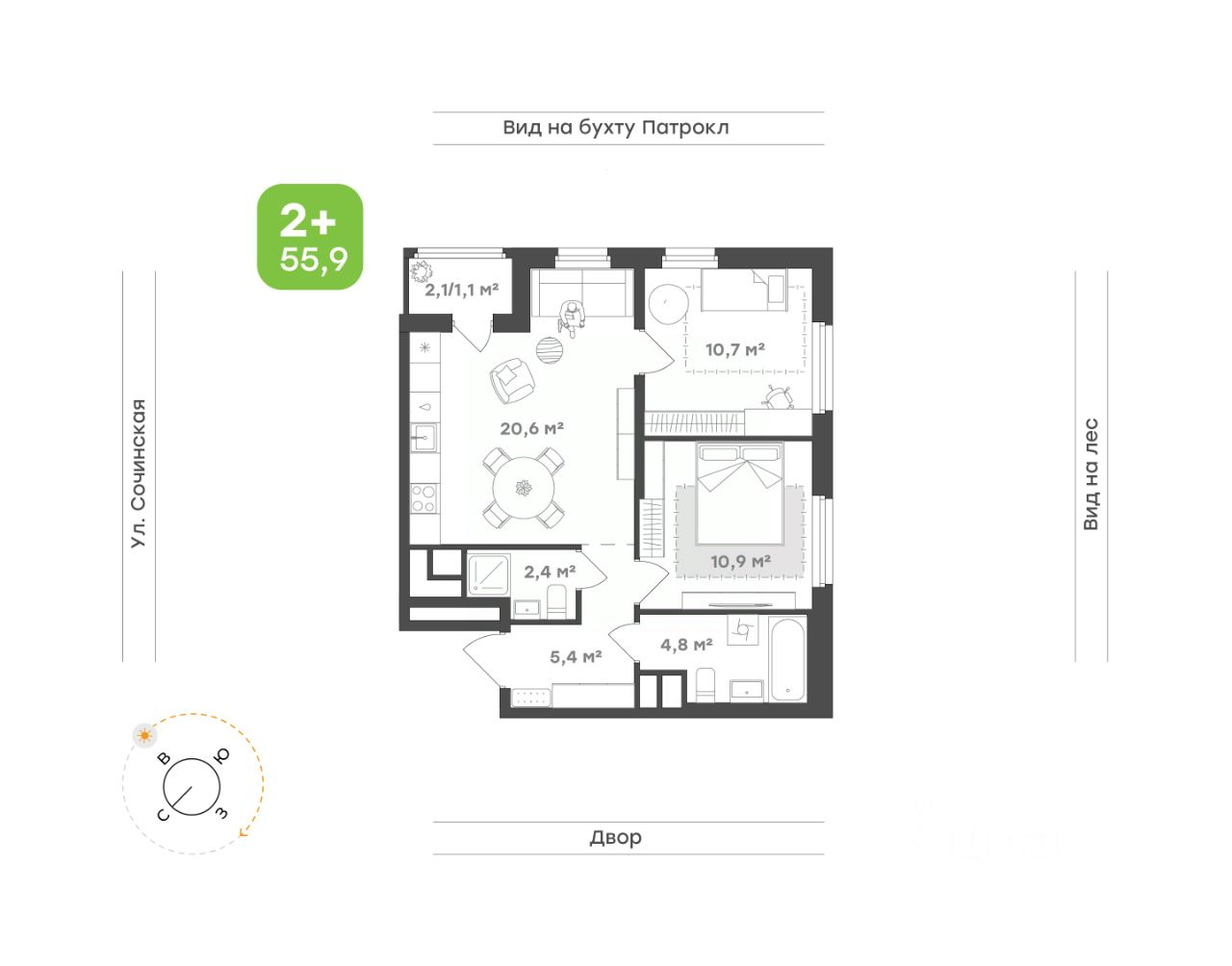 Просторная кухня-гостиная объединяет в себе место для семейных трапез и отдыха. Выход на компактную лоджию подарит возможность мгновенно окунуться в атмосферу комфорта и наслаждаться свежим воздухом