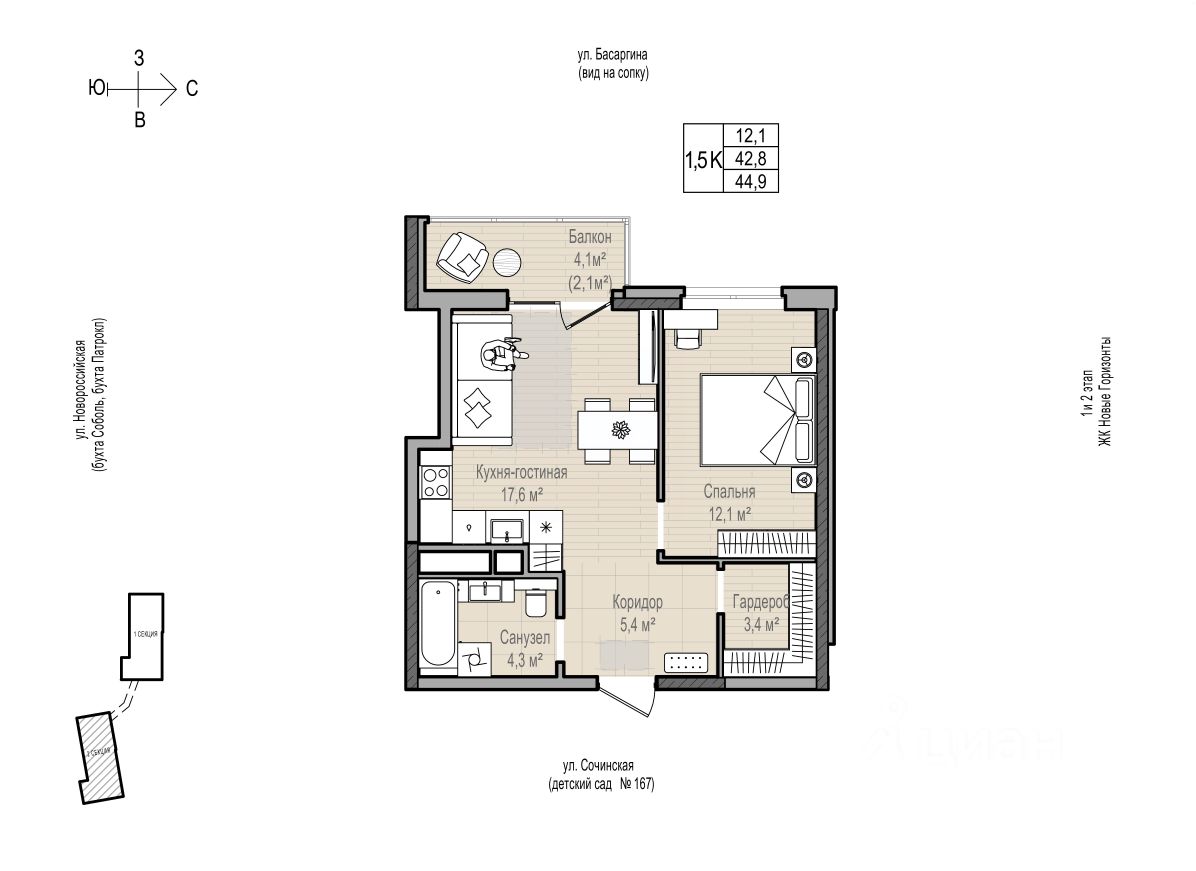 Кухня-гостиная 17,6 кв.м. с выходом на балкон для шумных компаний и тёплых встреч