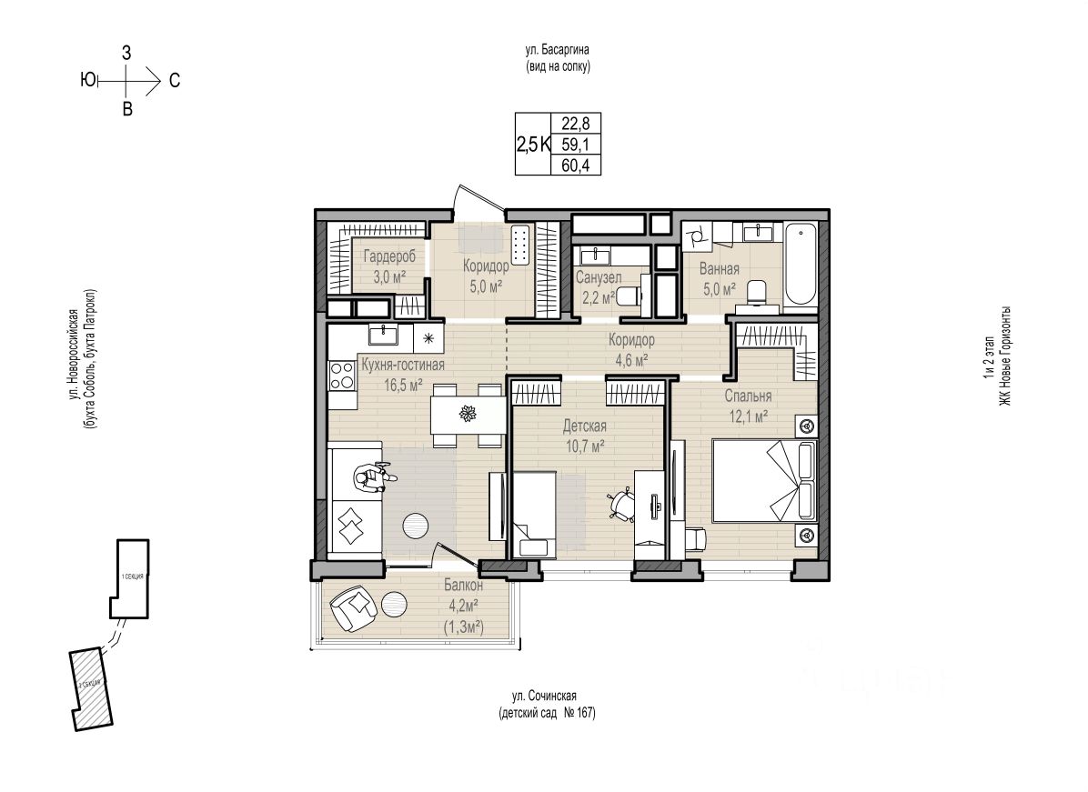 Раздельные ванная 5 кв.м. и санузел 2,2 кв.м. для быстрых утренних сборов