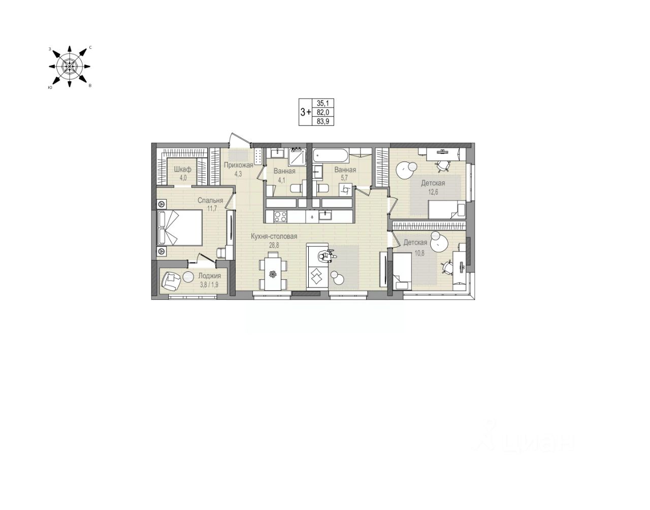 Максимальный комфорт для большой семьи Кухня-столовая 28,8 кв.м станет настоящим сердцем квартиры, где можно готовить семейные завтраки и ужины, а также проводить время в кругу близких людей Две детские комнаты 12,6 кв.м и 10,8 кв.м обеспечат комфорт для развития и игр вашим детям Родительская спальня 11,7 кв.м с выходом на лоджию место для отдыха после рабочего дня и романтических вечеров Гардеробная 4 кв.м в спальне позволит поддерживать порядок в квартире Два санузла для экономии времени всей семьи