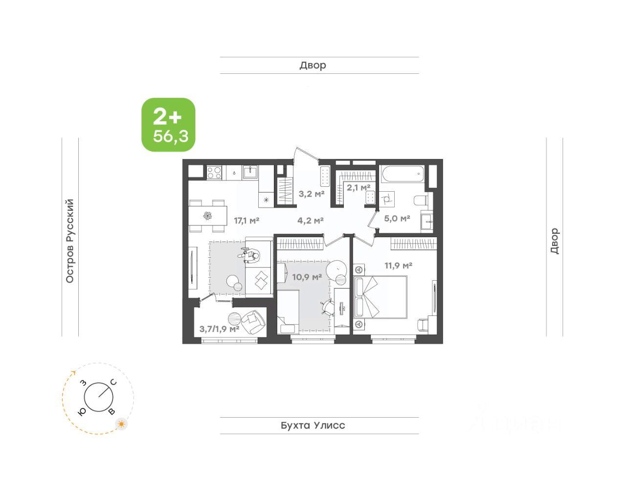 Удобное расположение кухни-столовой 17,1 кв.м с выходом на лоджию вдохновляет на приготовление вкусных блюд и встречу гостей