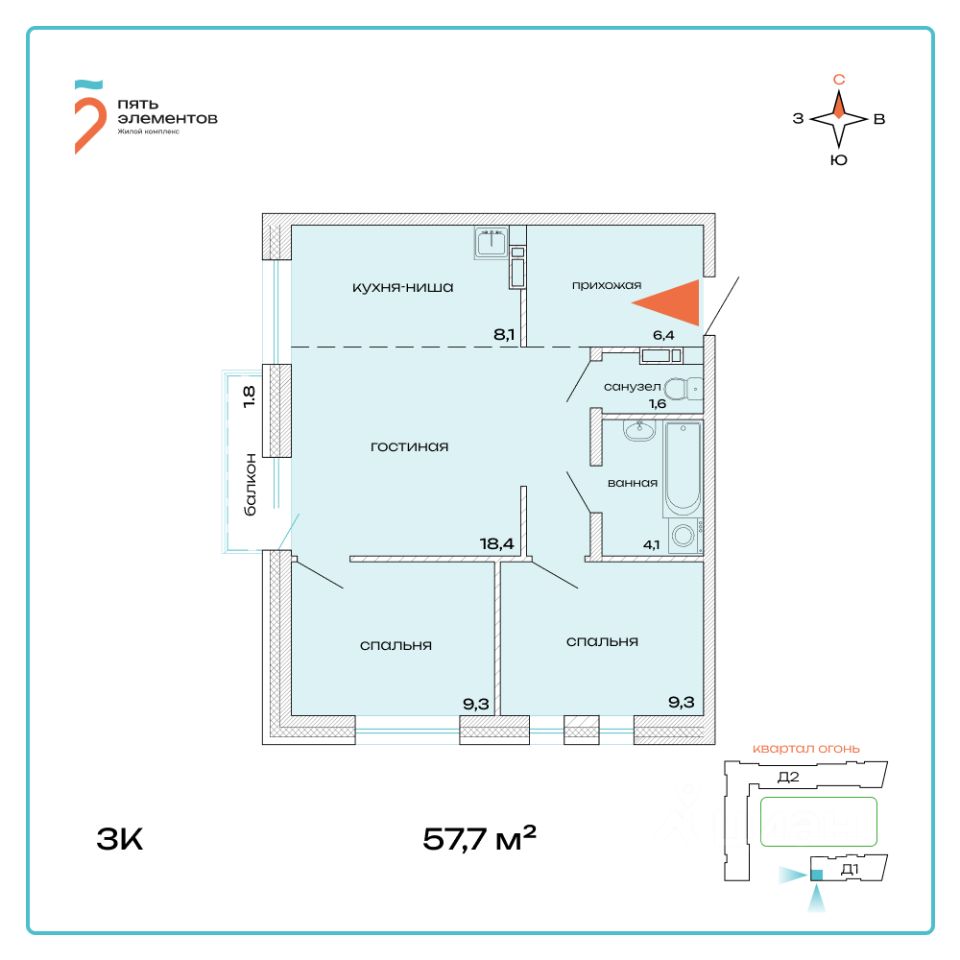 Продаётся 3-комнатная квартира в строящемся доме (Дом 1), срок сдачи: II-кв. 2027, общей площадью 57.7 кв.м., на 3 этаже. "Пять элементов" - современный жилой комплекс в пригороде Владивостока.