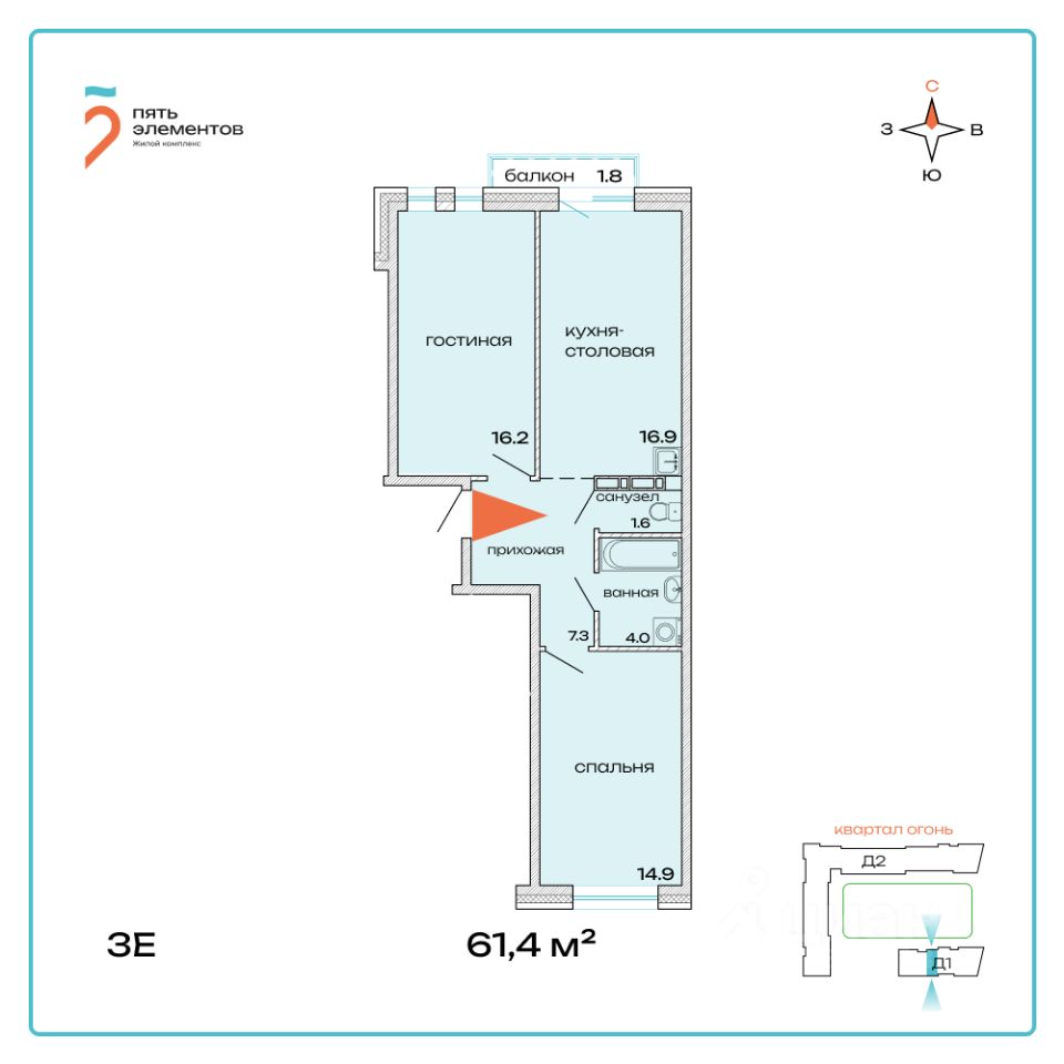 Продаётся 3-комнатная квартира в строящемся доме (Дом 1), срок сдачи: I-кв. 2027, общей площадью 61.4 кв.м., на 4 этаже. "Пять элементов" - современный жилой комплекс в пригороде Владивостока.