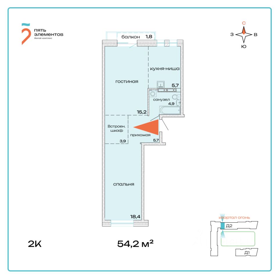 Продаётся 2-комнатная квартира в строящемся доме (Дом 2), срок сдачи: I-кв. 2027, общей площадью 54.2 кв.м., на 8 этаже. "Пять элементов" - современный жилой комплекс в пригороде Владивостока.