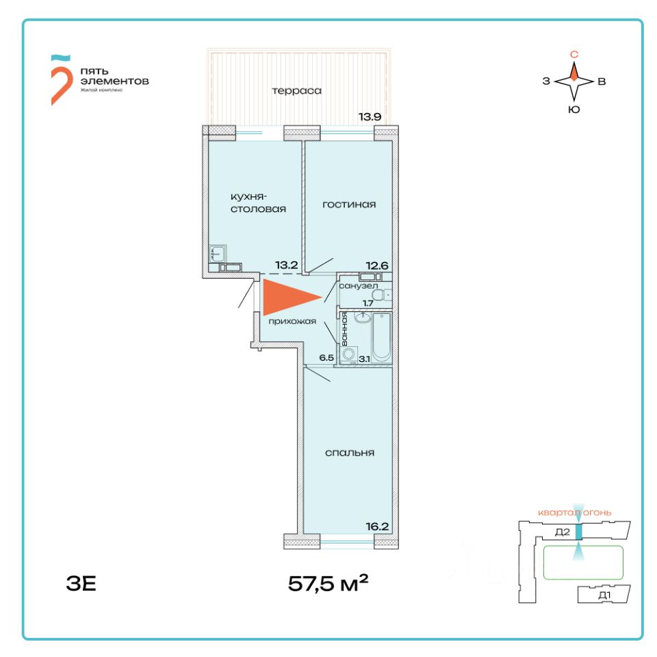 Продаётся 3-комнатная квартира в строящемся доме (Дом 2), срок сдачи: I-кв. 2027, общей площадью 57.5 кв.м., на 1 этаже. "Пять элементов" - современный жилой комплекс в пригороде Владивостока.