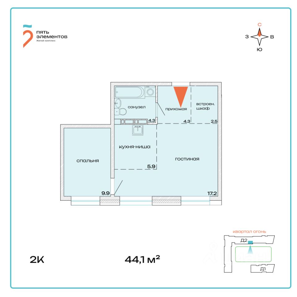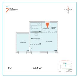 Продаётся 2-комнатная квартира в строящемся доме (Дом 2), срок сдачи: I-кв. 2027, общей площадью 44.1 кв.м., на 1 этаже. "Пять элементов" - современный жилой комплекс в пригороде Владивостока.
