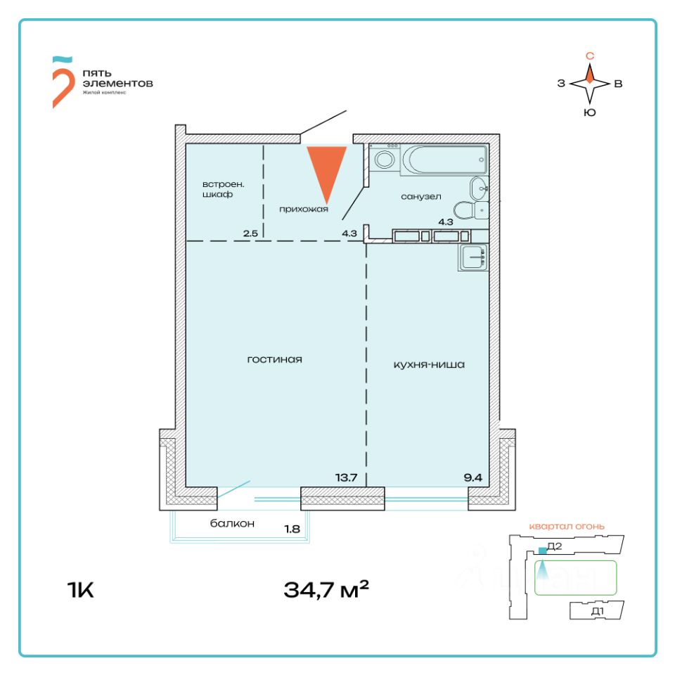 Продаётся 1-комнатная квартира в строящемся доме (Дом 2), срок сдачи: I-кв. 2027, общей площадью 34.7 кв.м., на 3 этаже. "Пять элементов" - современный жилой комплекс в пригороде Владивостока.