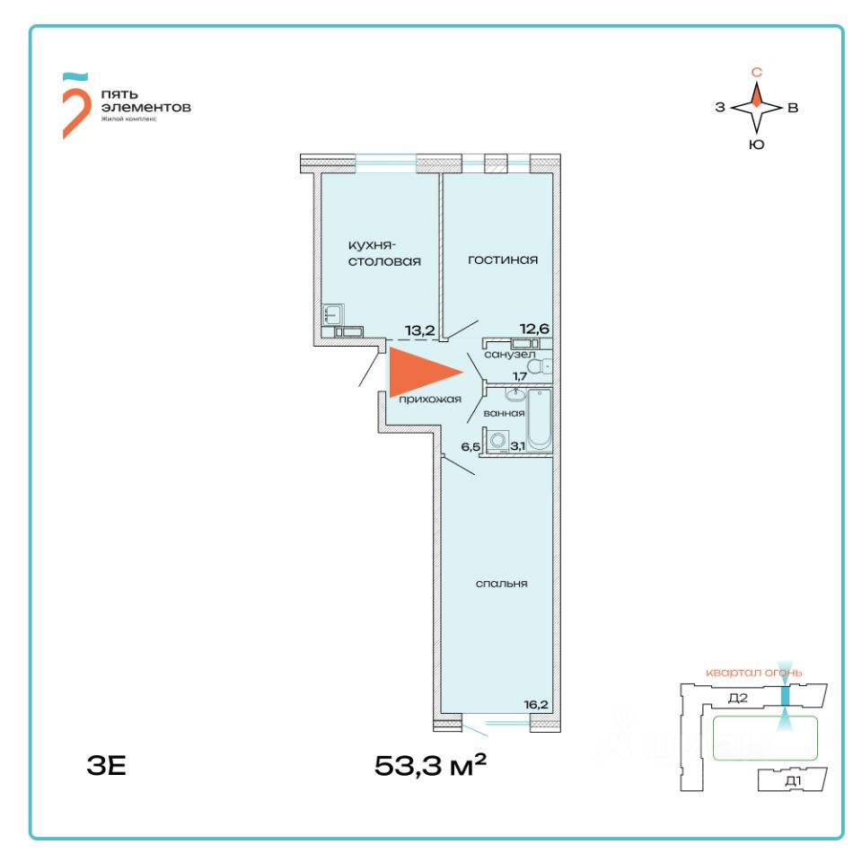 Продаётся 3-комнатная квартира в строящемся доме (Дом 2), срок сдачи: I-кв. 2027, общей площадью 53.3 кв.м., на 1 этаже. "Пять элементов" - современный жилой комплекс в пригороде Владивостока.