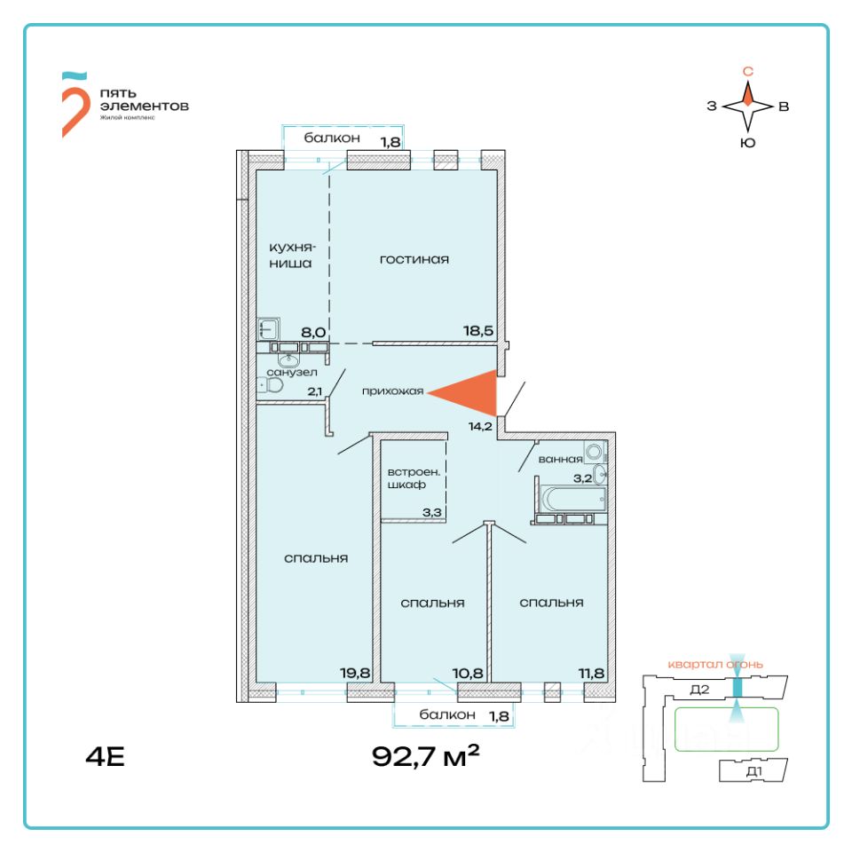 Продаётся 4-комнатная квартира в строящемся доме (Дом 2), срок сдачи: I-кв. 2027, общей площадью 92.7 кв.м., на 7 этаже. "Пять элементов" - современный жилой комплекс в пригороде Владивостока.