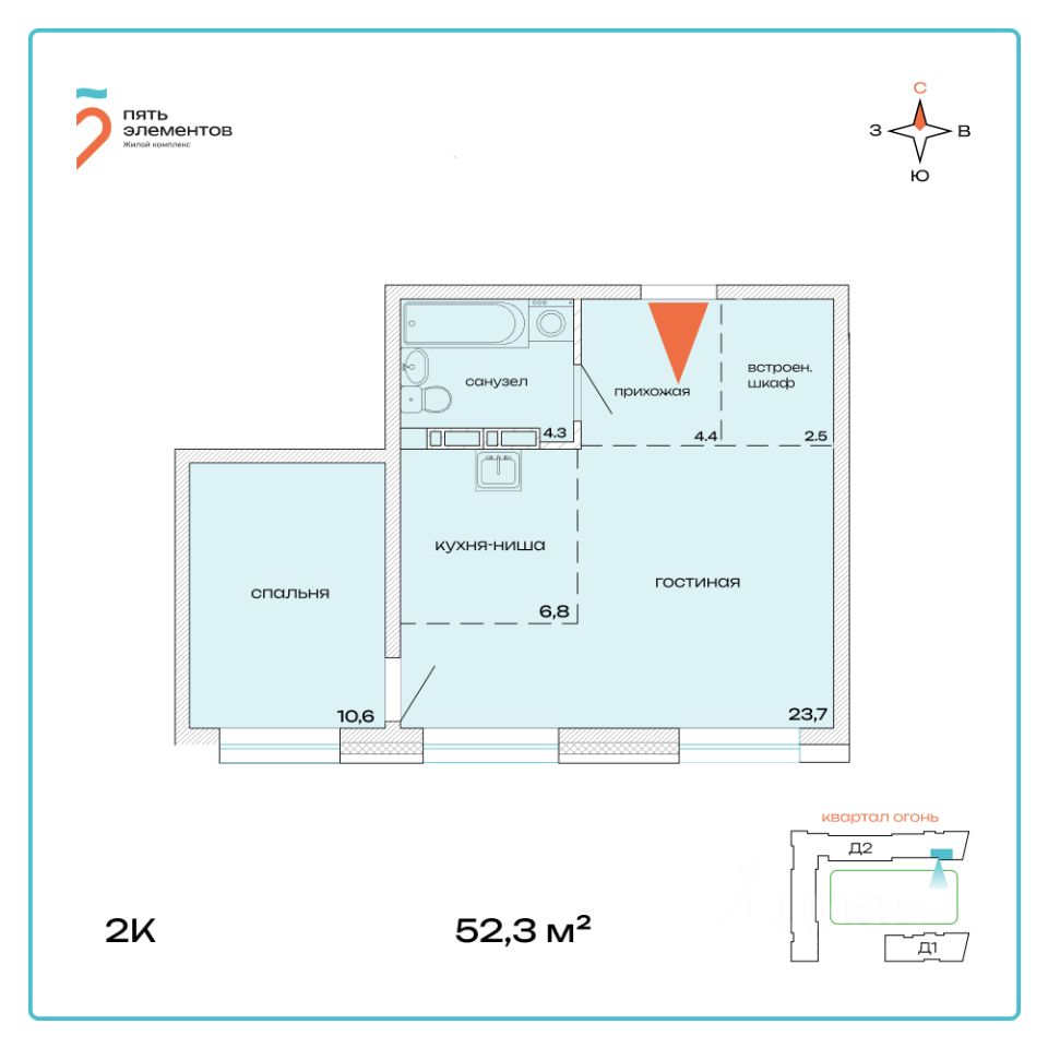 Продаётся 2-комнатная квартира в строящемся доме (Дом 2), срок сдачи: I-кв. 2027, общей площадью 52.3 кв.м., на 1 этаже. "Пять элементов" - современный жилой комплекс в пригороде Владивостока.
