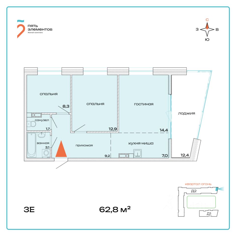 Продаётся 3-комнатная квартира в строящемся доме (Дом 2), срок сдачи: I-кв. 2027, общей площадью 62.8 кв.м., на 2 этаже. "Пять элементов" - современный жилой комплекс в пригороде Владивостока.