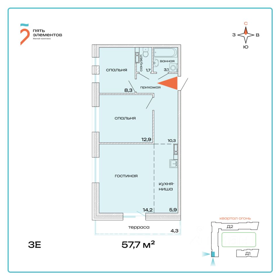 Продаётся 3-комнатная квартира в строящемся доме (Дом 2), срок сдачи: I-кв. 2027, общей площадью 57.7 кв.м., на 6 этаже. "Пять элементов" - современный жилой комплекс в пригороде Владивостока.