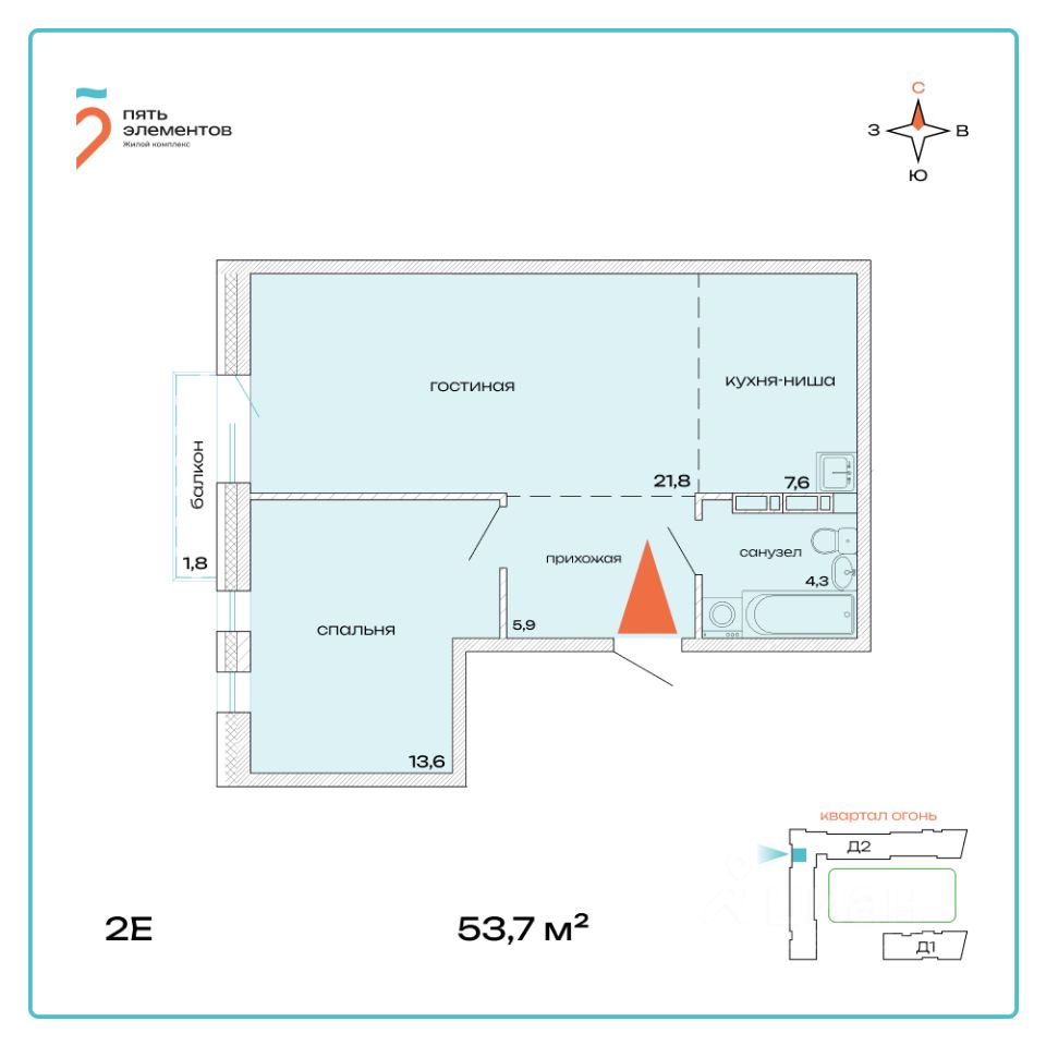 Продаётся 2-комнатная квартира в строящемся доме (Дом 2), срок сдачи: I-кв. 2027, общей площадью 53.7 кв.м., на 3 этаже. "Пять элементов" - современный жилой комплекс в пригороде Владивостока.