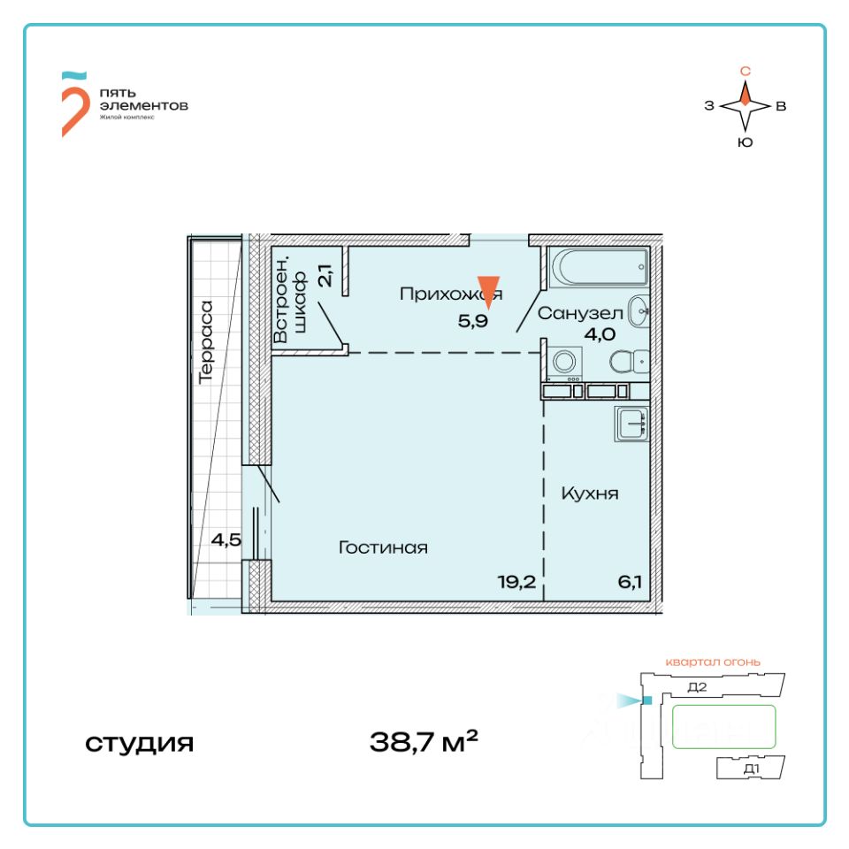 Продаётся 2-комнатная квартира в строящемся доме (Дом 2), срок сдачи: I-кв. 2027, общей площадью 38.7 кв.м., на 5 этаже. "Пять элементов" - современный жилой комплекс в пригороде Владивостока.