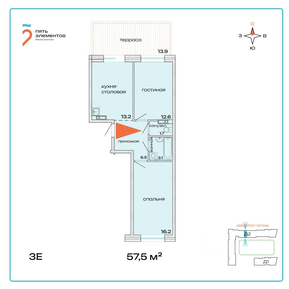 Продаётся 3-комнатная квартира в строящемся доме (Дом 2), срок сдачи: I-кв. 2027, общей площадью 57.5 кв.м., на 1 этаже. "Пять элементов" - современный жилой комплекс в пригороде Владивостока.