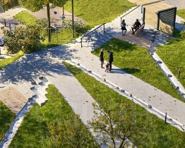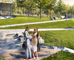 В квартале будет много мест для отдыха и активных игр, три вида парков и даже родник, который будет перетекать в ручей с порогами и препятствиями. На территории парков появятся амфитеатры и террасы. Здесь жители смогут отдыхать, гулять, общаться, учиться или работать на свежем воздухе. На естественных склонах будут обустроены игровые зоны для детей - с горками, сетками, канатами и скалолазными зацепами.