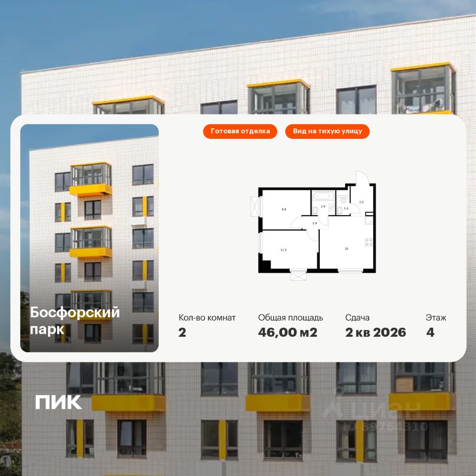 Продаётся 2-комн. квартира площадью 46 кв.м на 4 этаже 9 этажного дома (Корпус 4, Секция 1) проекта ПИК Босфорский парк. Светлый просторный подъезд на уровне земли, функциональная планировка, большие окна, c отделкой.