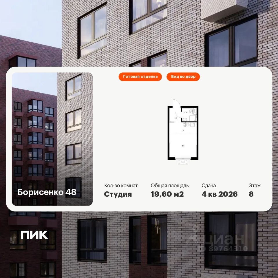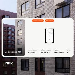 Продаётся квартира-студия площадью 19,6 кв.м на 8 этаже 17 этажного дома (Корпус 1, Секция 1) проекта ПИК Борисенко 48. Светлый просторный подъезд на уровне земли, функциональная планировка, большие окна, c отделкой.