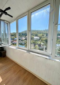 Большая застеклённая лоджия — можно использовать как зону отдыха или рабочий уголок