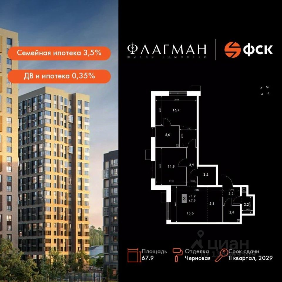 Продаётся 3-к квартира номер 229 общей площадью 67.9 кв.м. на 21-м этаже 30 этажного дома. Отделка Whitebox. Цена с учётом скидки!