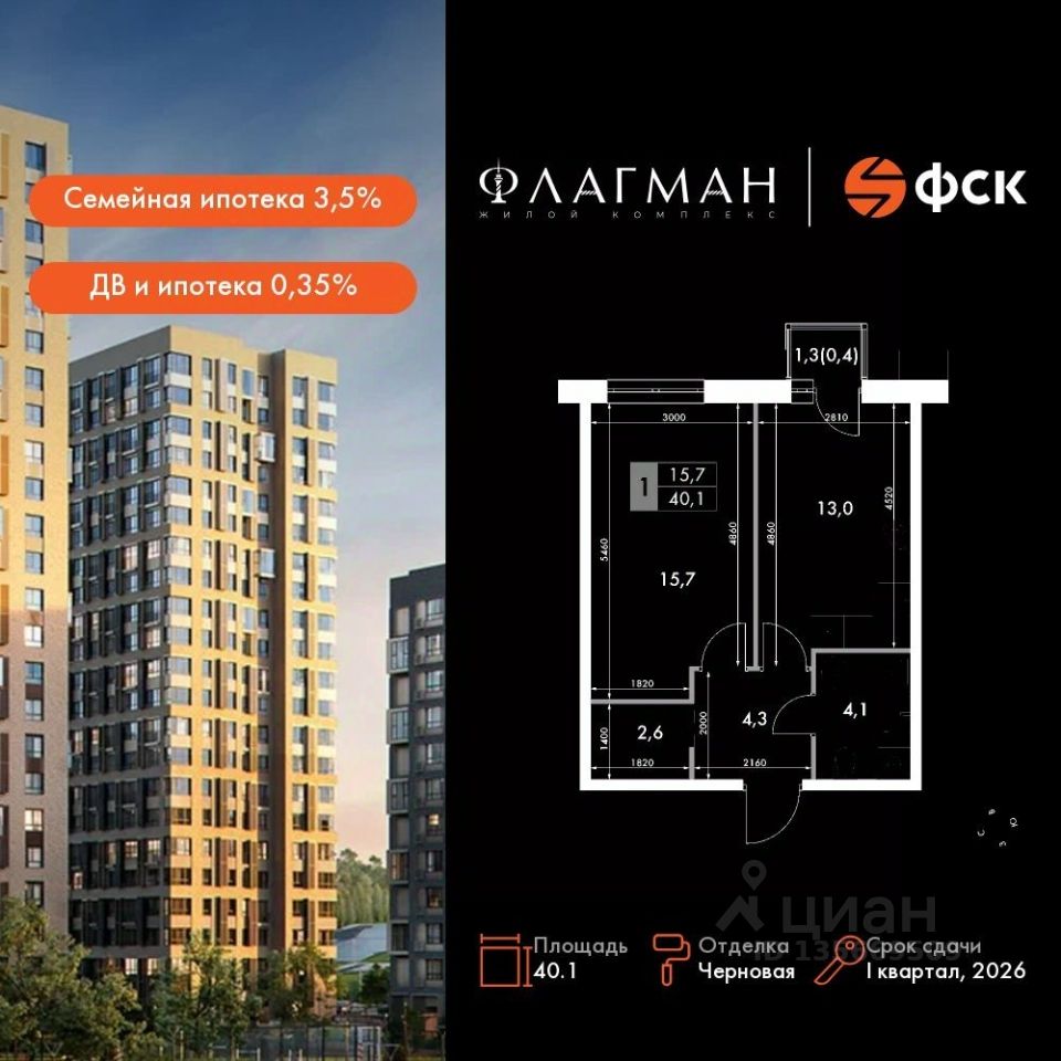 Продаётся 1-к квартира номер 123 общей площадью 40.1 кв.м. на 12-м этаже 24 этажного дома. Отделка Whitebox. Цена с учётом скидки!