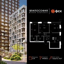 Продаётся 3-к квартира номер 430 общей площадью 72.8 кв.м. на 9-м этаже 10 этажного здания. Отделка Whitebox. Цена с учётом скидки.