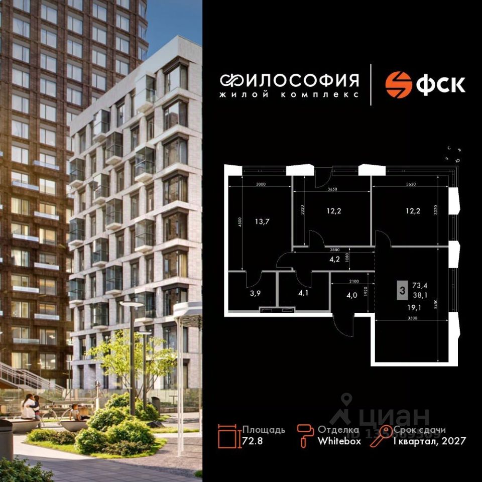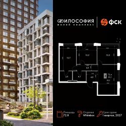 Продаётся 3-к квартира номер 418 общей площадью 72.8 кв.м. на 6-м этаже 10 этажного здания. Отделка Whitebox. Цена с учётом скидки.