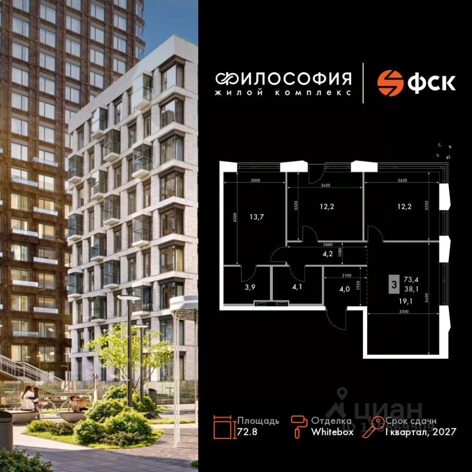 Продаётся 3-к квартира номер 410 общей площадью 72.8 кв.м. на 4-м этаже 10 этажного здания. Отделка Whitebox. Цена с учётом скидки.