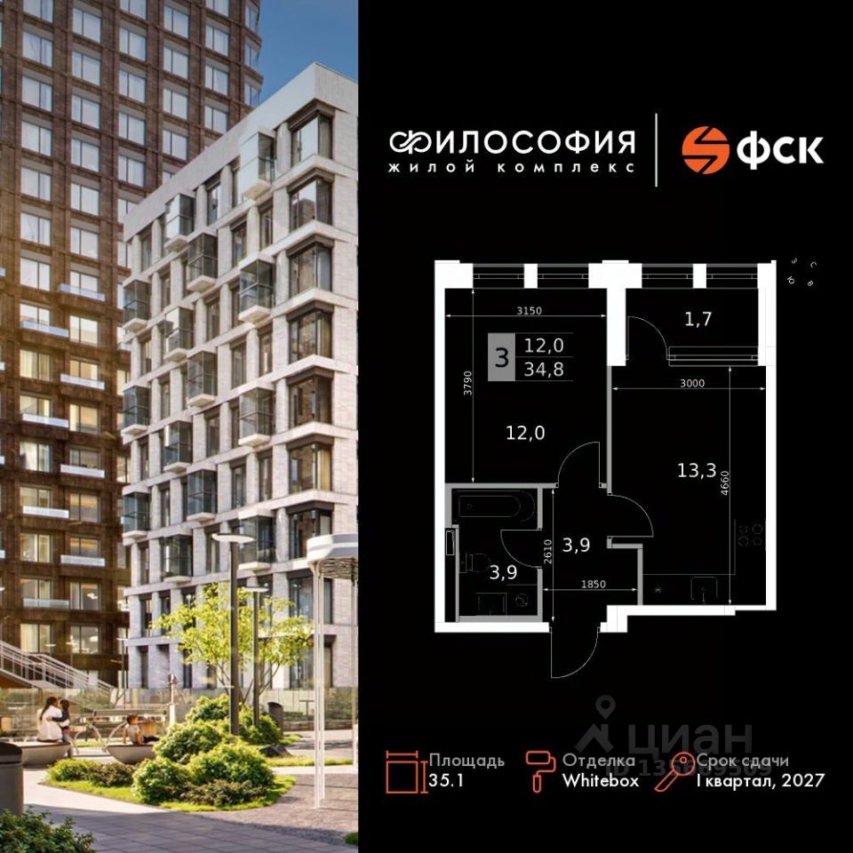 Продаётся 1-к квартира номер 192 общей площадью 35.1 кв.м. на 9-м этаже 14 этажного здания. Отделка Whitebox. Цена с учётом скидки.