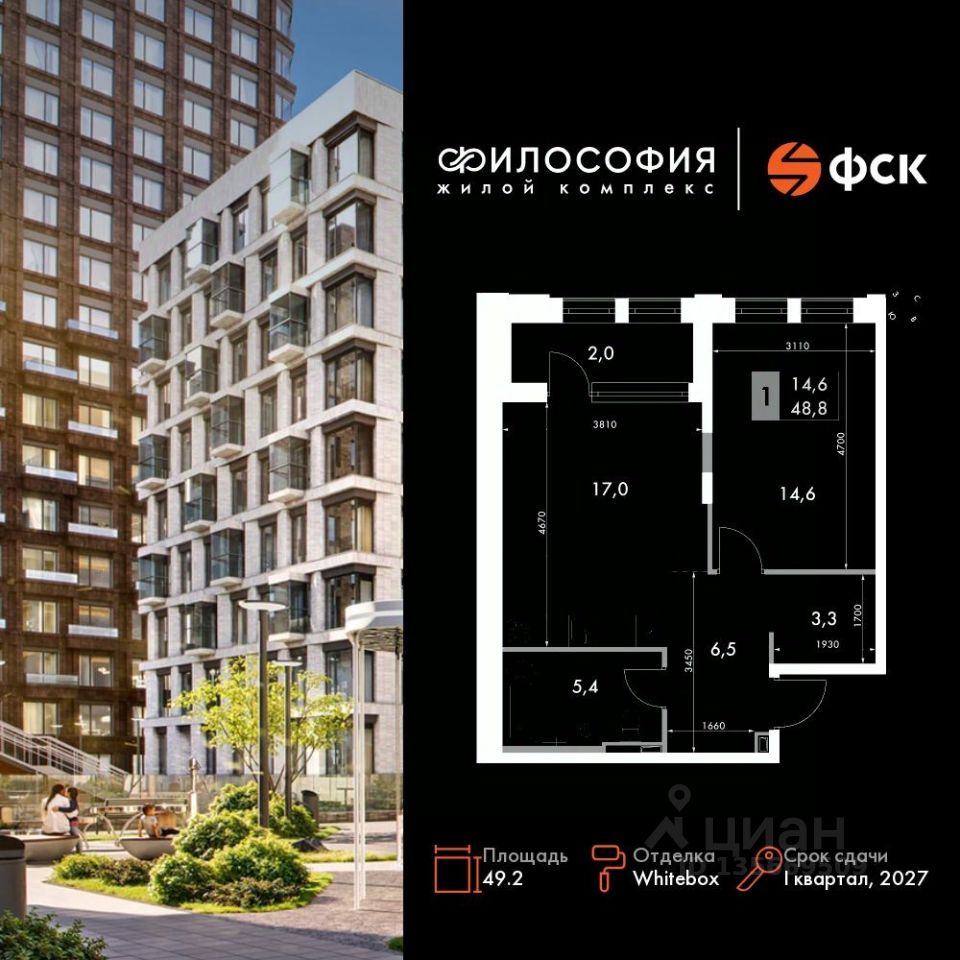 Продаётся 1-к квартира номер 132 общей площадью 49.2 кв.м. на 3-м этаже 14 этажного здания. Отделка Whitebox. Цена с учётом скидки.