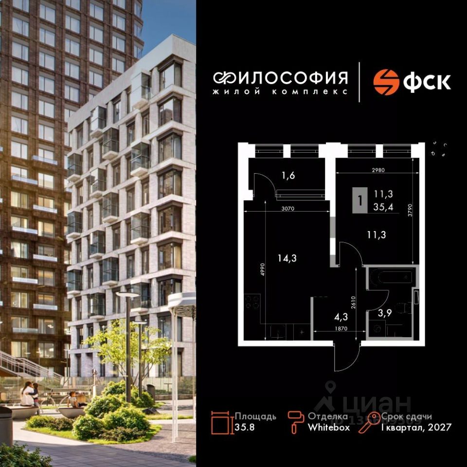 Продаётся 1-к квартира номер 153 общей площадью 35.8 кв.м. на 5-м этаже 14 этажного здания. Отделка Whitebox. Цена с учётом скидки.