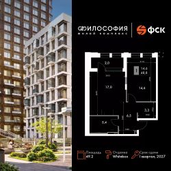 Продаётся 1-к квартира номер 162 общей площадью 49.2 кв.м. на 6-м этаже 14 этажного здания. Отделка Whitebox. Цена с учётом скидки.