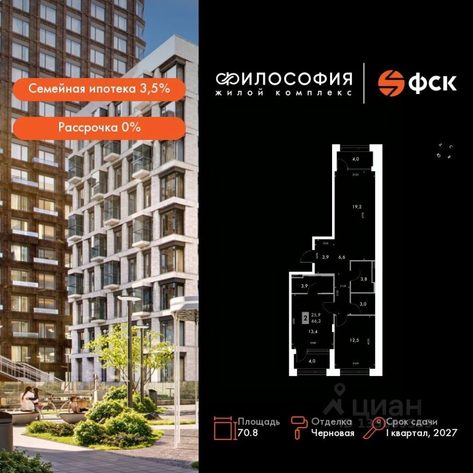 Продаётся 2-к квартира номер 195 общей площадью 70.8 кв.м. на 10-м этаже 14 этажного дома. Отделка Whitebox. Цена с учётом скидки!