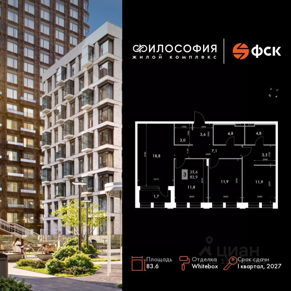 Продаётся 3-к квартира номер 205 общей площадью 83.6 кв.м. на 11-м этаже 14 этажного здания. Отделка Whitebox. Цена с учётом скидки.