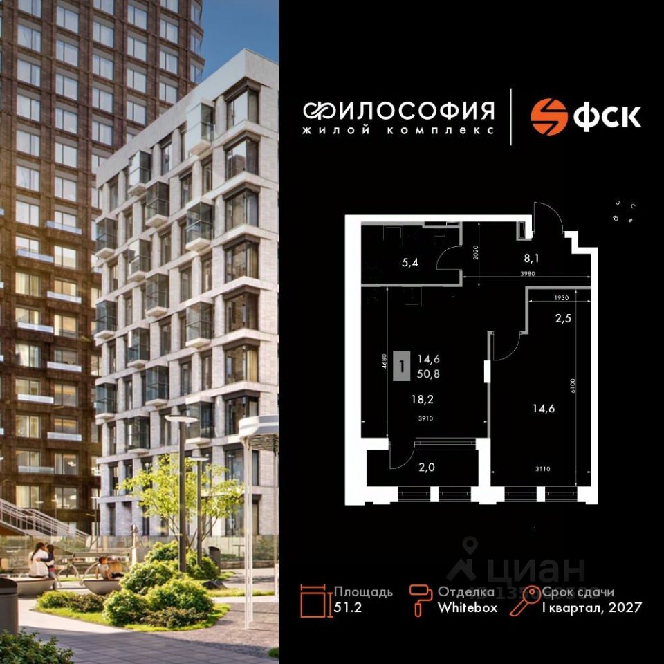Продаётся 1-к квартира номер 141 общей площадью 51.2 кв.м. на 4-м этаже 14 этажного здания. Отделка Whitebox. Цена с учётом скидки.