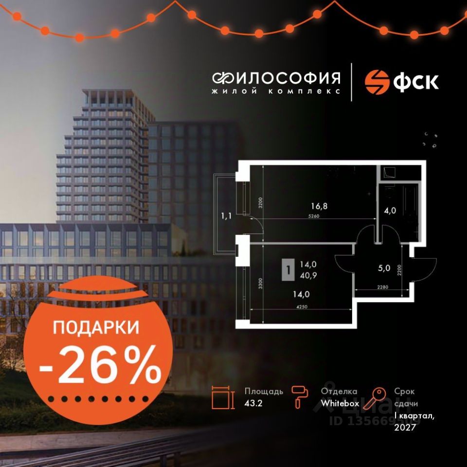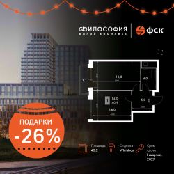 Продаётся 1-к квартира номер 293 общей площадью 43.2 кв.м. на 9-м этаже 23 этажного здания. Отделка Whitebox. Цена с учётом скидки.