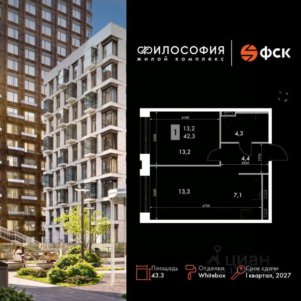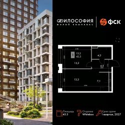 Продаётся 1-к квартира номер 223 общей площадью 43.3 кв.м. на 2-м этаже 23 этажного здания. Отделка Whitebox. Цена с учётом скидки.