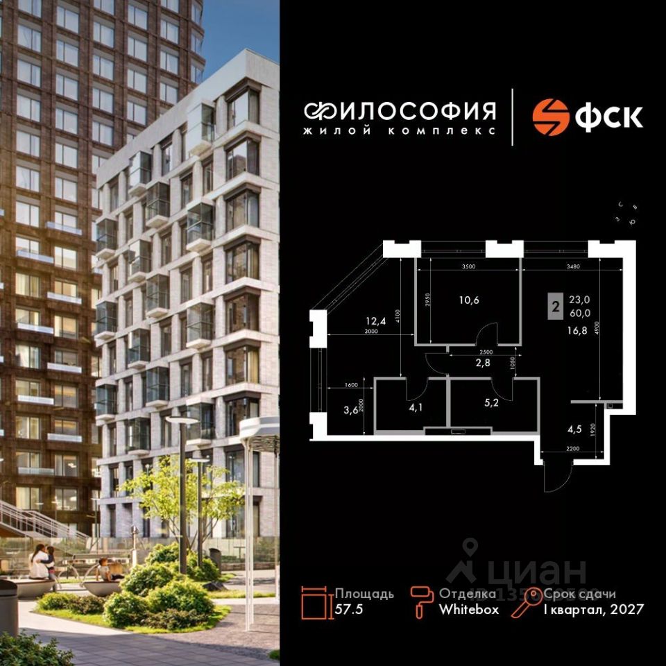 Продаётся 2-к квартира номер 224 общей площадью 57.5 кв.м. на 2-м этаже 23 этажного здания. Отделка Whitebox. Цена с учётом скидки.